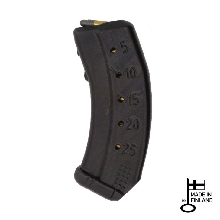 Tikka T1x är en utmärkt småviltsstudsare och som de flesta 22LR gevär levereras de med ett enkelstaplat magasin. Masiinatek tog detta till ritbordet och designade och tillverkade ett dubbelstaplat magasin som är väl lämpat för 3D-utskrift och som matas på ett tillförlitligt sätt. Tack vare denna konstruktion får man ett magasin med hög kapacitet med kompakt konstruktion. Magasinet har visningshål på sidan i femskottssteg så att du snabbt kan se hur många du har laddat.